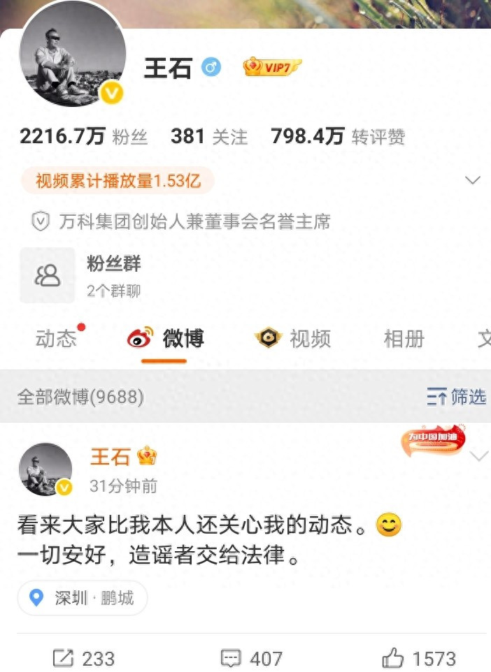 最绝的是,田朴珺说完也就一刻钟的功夫,王石本人亲自下场了。他发了一条微博,语气挺轻松的:“看来大家比我本人还关心我的动态。一切安好,造谣者交给法律。”